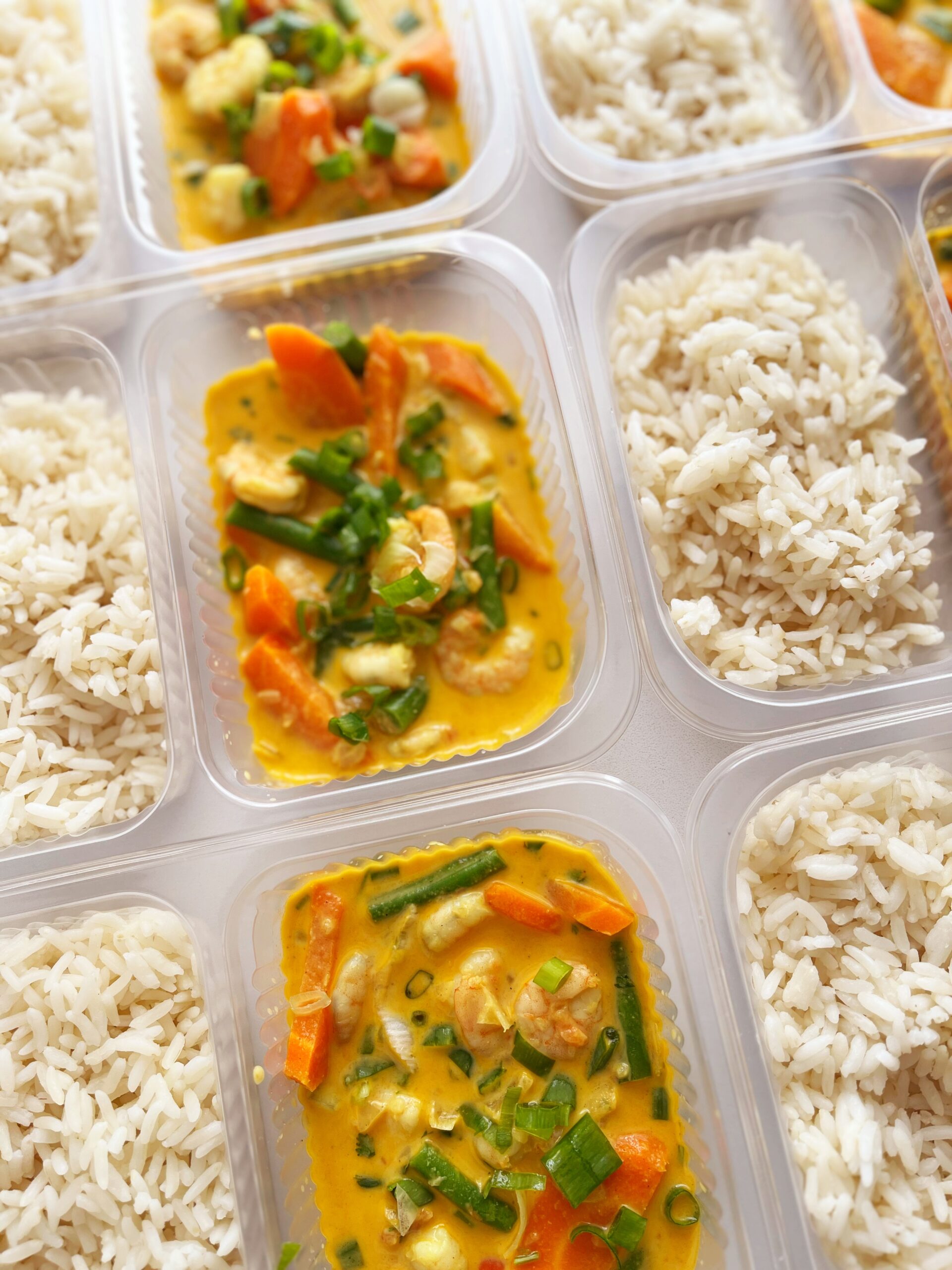Camarão tailandês com vagem e cenoura (200g), arroz branco (150g) – prato sem glúten/lactose