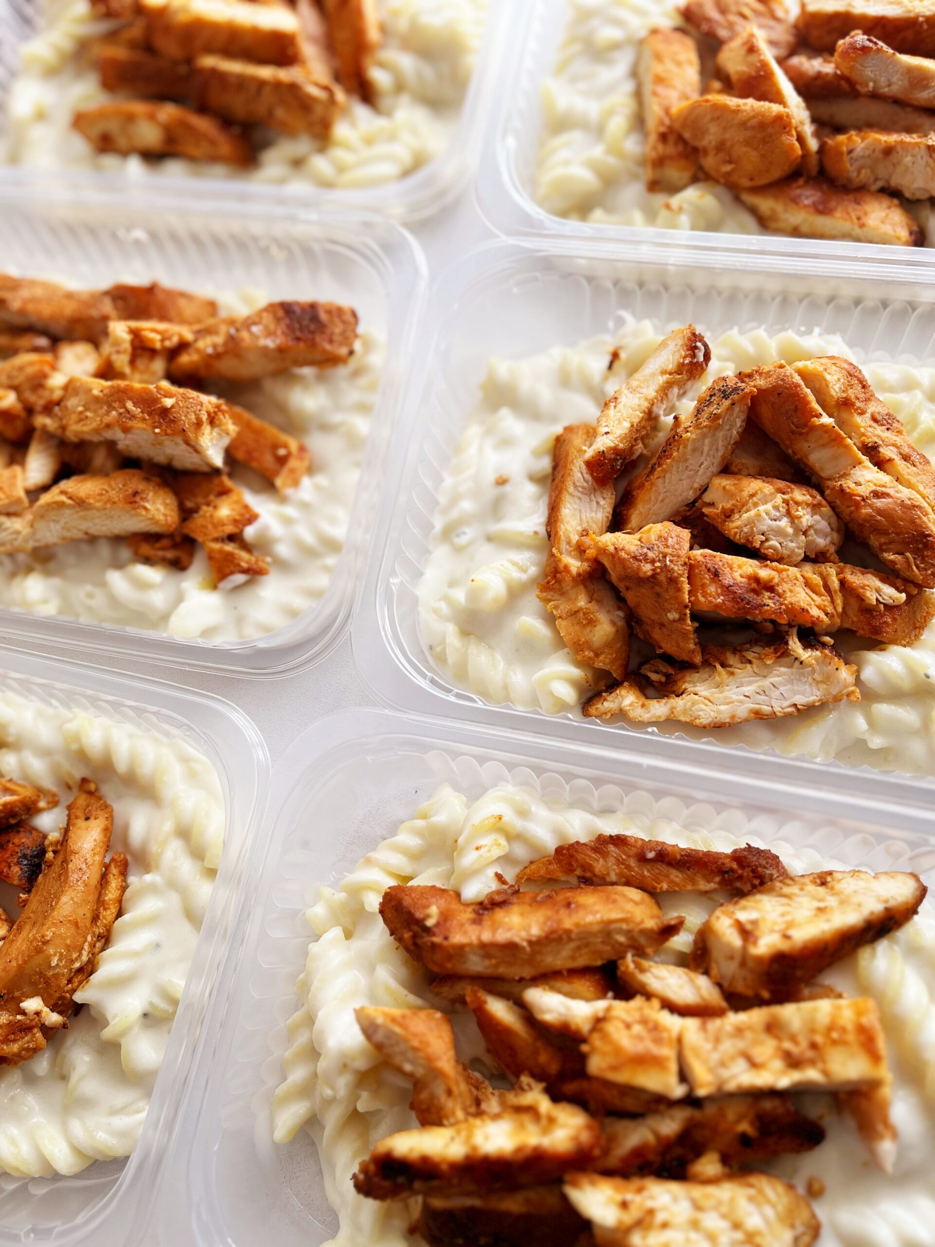 Filé de frango grelhado (100g), massa ao molho quatro queijos (250g) – prato sem glúten